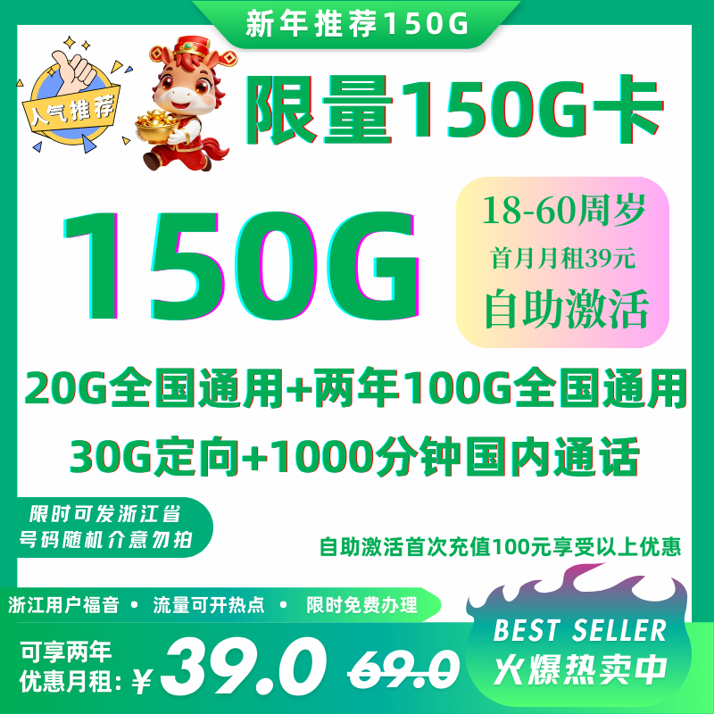 39元120G通用流量+30G定向流量+1000分钟(首充100元享两年优惠)